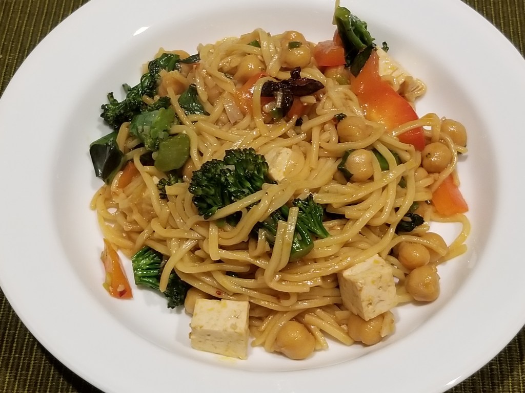 - Add tofu, chickpeas, and red bell pepper and sauté for 3-4 minutes