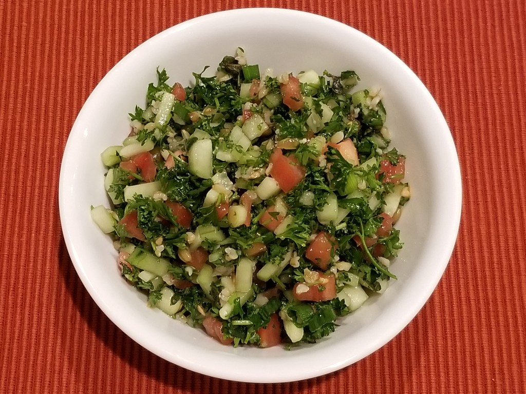 - Add the cooled bulgur, chopped fresh mint and green onion to the bowl of parsley. Strain off and discard the cucumber and tomato juice that has accumulated in the bottom of the bowl (this ensures that your tabbouleh isn’t too watery). Add the strained cucumber and tomato to the bowl.
