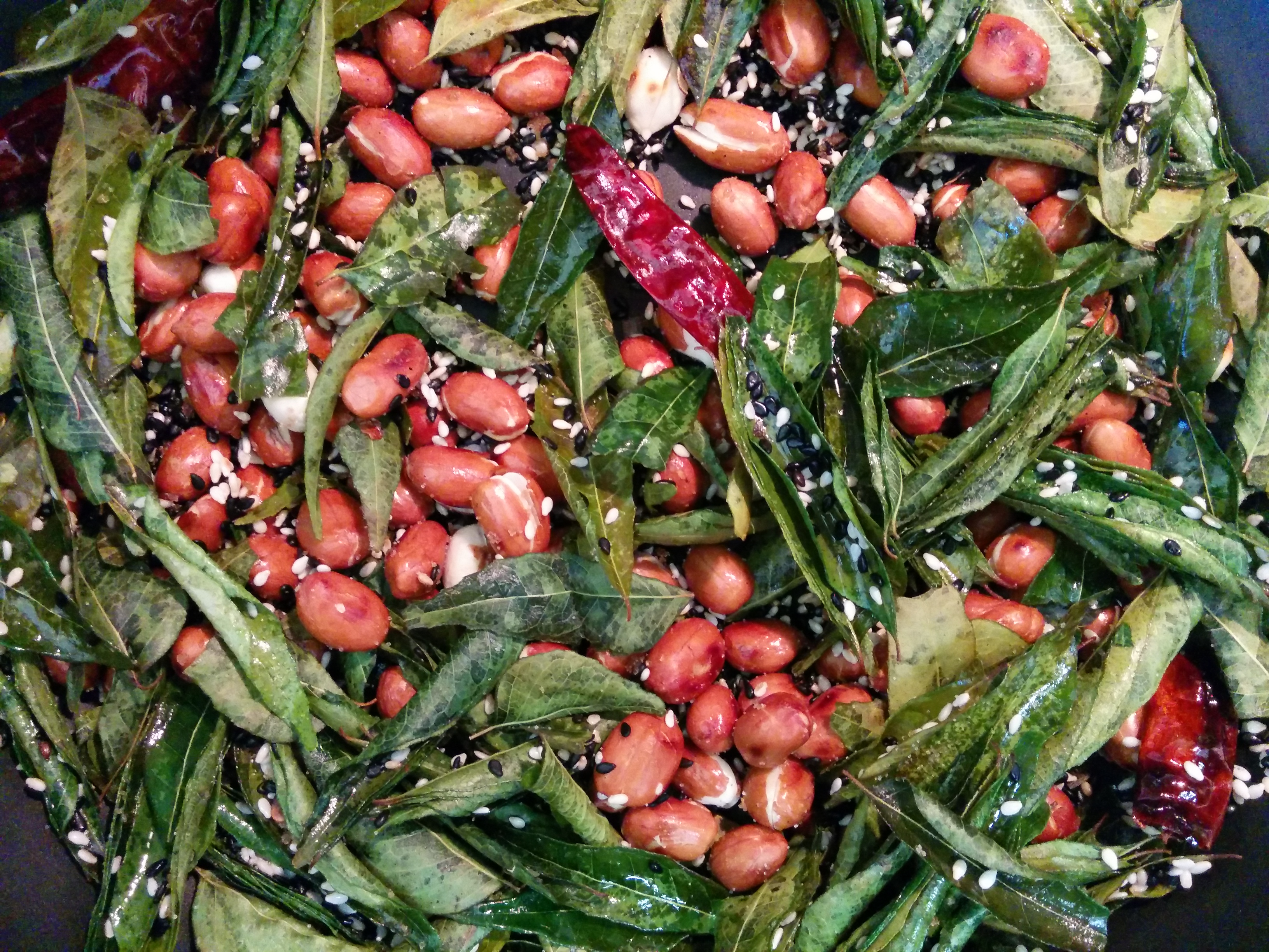 - Roast the leaves, peanuts, chilies and sesame seeds on low heat
