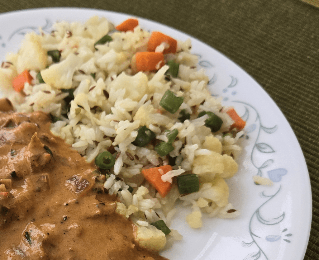 Garnish the pulao with chopped coriander and serve with any Indian curry!